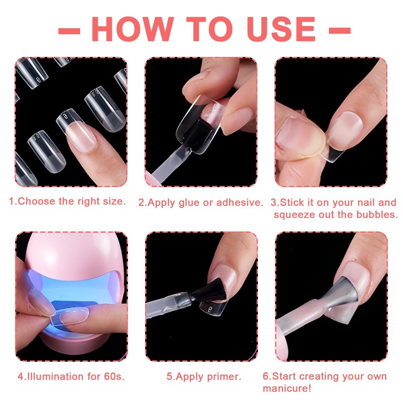 - Easy To Use - Simply trim and buff your natural nails, clean the nail surface, select a suitable nail tips for acrylic extensions, apply nail glue to the back of the tip, and press it onto your nail. Next, trim the tips to your desired length and finally apply your favorite nail color for a professional manicure effect at home.