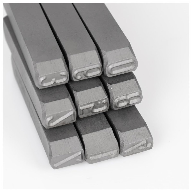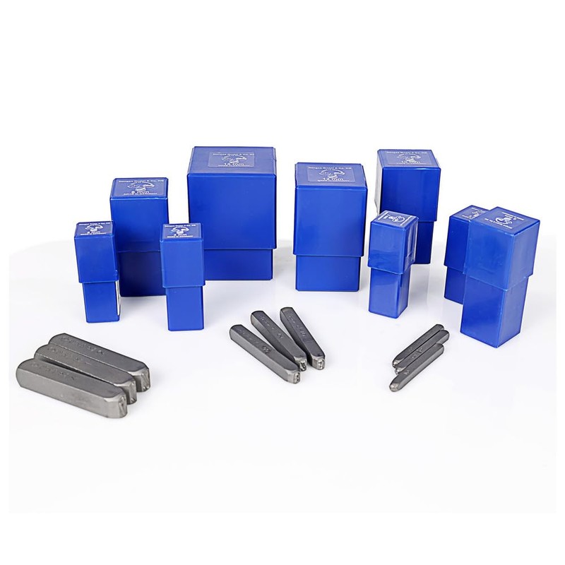 Discover the 9-piece Dönges hand impact stamp set, sharpened and perfect for workpieces with a strength of 600 - 800 N/mm². Made from blank-drawn tool steel in a silky gloss matt finish, the stamp set produces a typeface according to DIN 1451. The set comes packaged in a shatterproof, blue plastic box, and each stamp is marked with visual engraving, lettering height, the quality promise 'Made in Germany' and the logo 'Wear safety glasses'. Perfect for technical work.