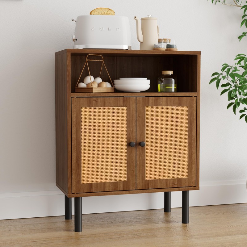 DongRong Rattan Storage Cabinet, Boho Accent Cabinet with Double Doors, Small Freestanding Sideboard for Hallway, Laundry Room,Kitchen, Dining Room, Entryway(Walnut)