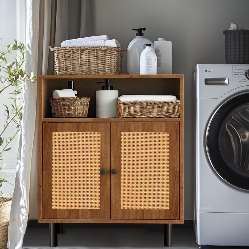 - Sufficient Storage Capacity: Its dimensions are 11.6'' (W) x 23.2'' (D) x 32'' (H). The first layer is an open compartment, which is convenient for some seasoned, coffee beans and other items; underneath is a storage space with two rattan doors, divided into upper and lower layers, which is convenient for placing some sundries that are not often used.