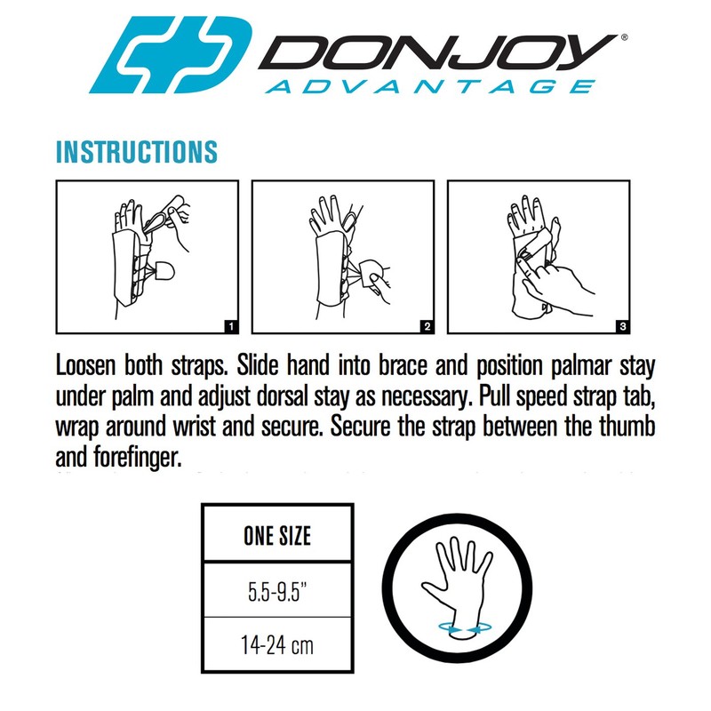 Get the right level of support you need to protect and immobilize your wrist. The DonJoy Advantage stabilizing speed-wrap wrist provides maximum protection to the wrist, as well as assistance to relieve Muscle soreness. As the wrist heals, use the removable palmar and movable dorsal stay to personalize the fit and support. The quick and effortless speed-lace system allows for easy on/off application and simple adjustments that might be needed throughout the day. Designed with a foam laminate and soft liner, you'll experience breathability and comfort all-day in the stabilizing speed-wrap wrist. Ideal to treat Carpal Tunnel, mild wrist sprains and strains, tendonitis, and wrist instabilities. Best to use for immobilization, typing, and repetitive motion activities.