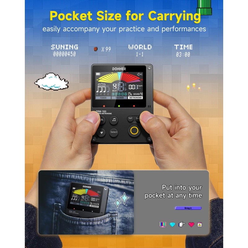 【 Training Rhythm Mode 】The Donner DBM-100 tuner metronome features an innovative training rhythm mode. The built-in microphone detects whether your sound matches the current rhythm and provides dynamic feedback through a light display. Blind rhythm tests help improve timing accuracy.