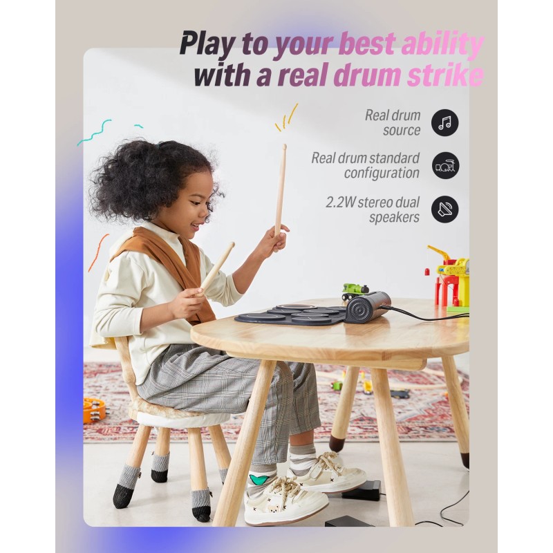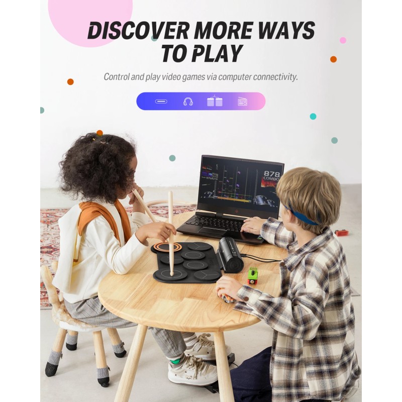 - [ MIDI Connect & Gameplay ] Come with standard midi out jack and USB midi out jack, you can connect the drum to computers to produce music or play games, or connect external speakers for familyentertainment/birthday parties. Perfect for adults who need MIDI functionality and children for entertainment.
