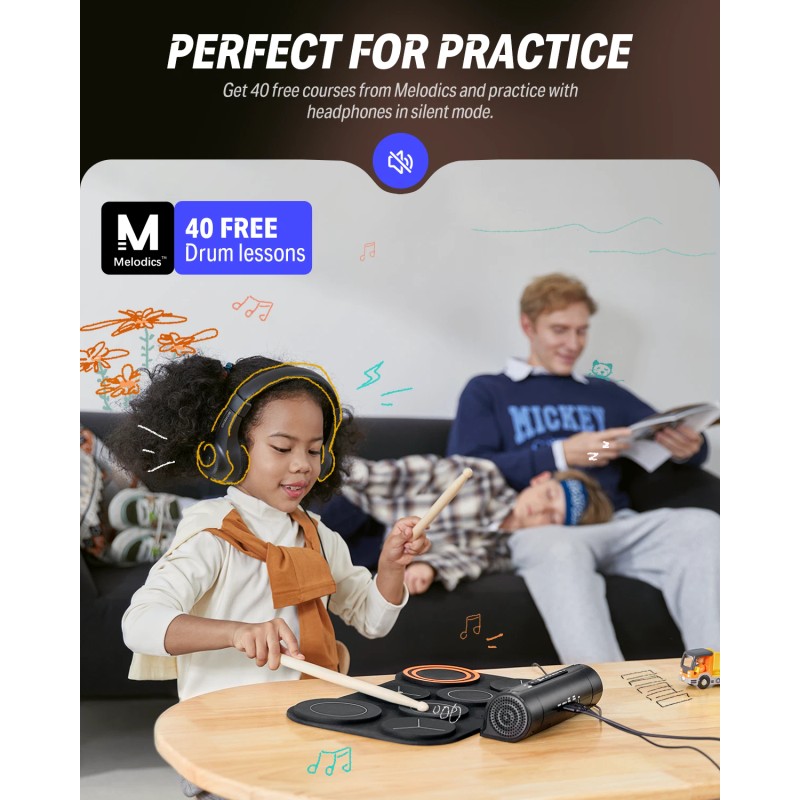 - [ 40 Free and Entertaining Drum Lessons from Melodics ] We have carefully created drum teaching courses for users ranging from beginner to advanced, which can effectively help drummers practice beats, build a good sense of music, and improve learning efficiency. 40 free and entertaining courses are sufficient to master all aspects of arrangement creation. Then comes your free time to create! Remember to get the course from customer service!