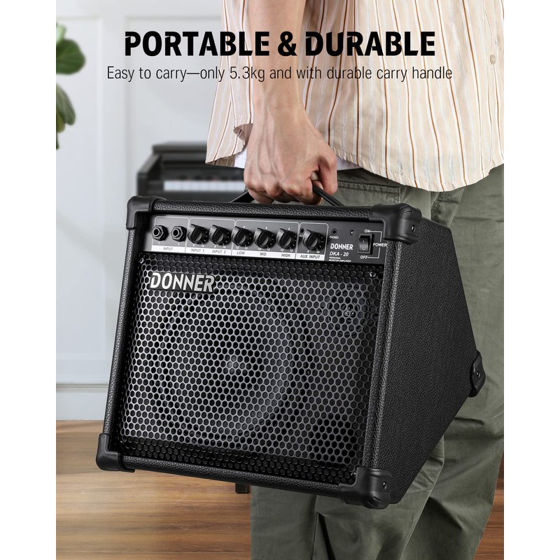 Donner DKA-20 Keyboard Amplifier 20 Watt Keyboard AMP with Aux in and Two Channels, Bass Guitar Amp, Piano Amplifier, Electronic Drum Speaker Support for Microphone Input