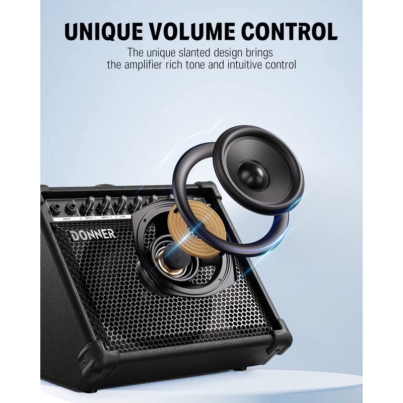 Donner DKA-20 20W Keyboard Amplifier provides explosive tone with intuitive controls at a great price. The Volume controls how loud your amplifier is. The Treble/ Middle /Bass controls help you shape the high and low frequencies of your Keyboard tone. The DKA-20 features a 8-inch Special Design Low Frequency speaker and 2-inch Special Design High frequency speaker . Jam along with your favorite tracks by simply plugging your MP3 player into the Auxiliary input and you instantly become part of the band and /or practice privately with the 1/8" headphone output jack that also mutes the speaker output. Closed-back design gives a heavier bass response. The edge is surrounded by hard material, protecting the amplifier from damage and pad of rubber makes it stand safe and stable.DI output port for external active speakers