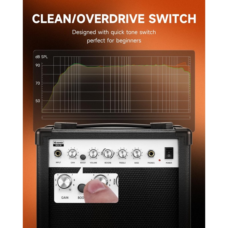 - [Convenient Clean/Overdrive Switch] With a frequency response range of 40Hz-20kHz, DEA-20 features a one-click clean/overdrive switch for easy, beginner-friendly operation.