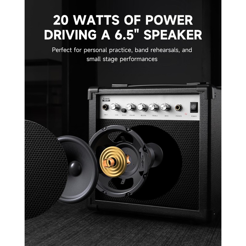 - [20 Watts, Built-in 6.5' Speaker] With 20 watts of power driving a 6.5" speaker, the DEA-20 is ideal for personal practice, band rehearsals, and small stage performances.