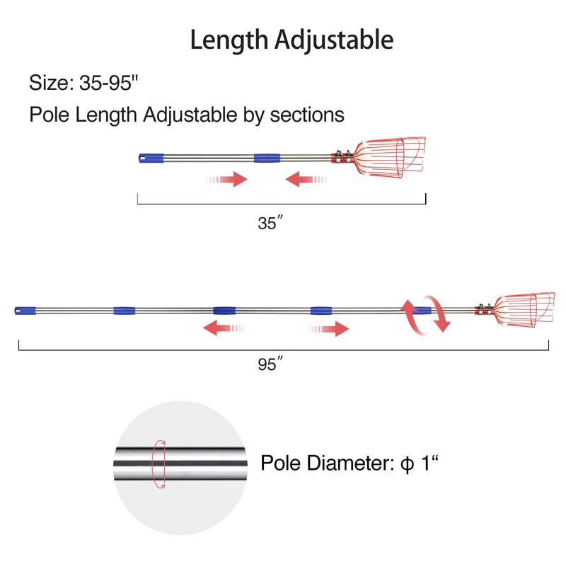 Fruit Picker Basket with Pole - Heavy Duty Apple Picker Pole with Basket Telescoping for Fruit Picking, SilverExtendable Length:*Length adjustable by sections.*Optional Sizes: 35-65", 35-95", 35-120Multiple Use:This fruit picker tool uses a special long handle design and is a nice practical hand tool for gardeners. It can be used for daily garden pick on fruit picking, leaf grabber and more as need.Funny Design:Designed as orange picker, blueberry picker, berry picker, nut picker, walnut picker, pecan picker, acorn picker for fruit tree orchard, garden, farmyard.Sturdy Quality:Material of Poles: Premium SteelMaterial of Head Basket: Premium SteelMaterial of Handle Top: PlasticPole Diameter: 1"You smiled is happiness! Merry Christmas, guys!-From DonSail US store