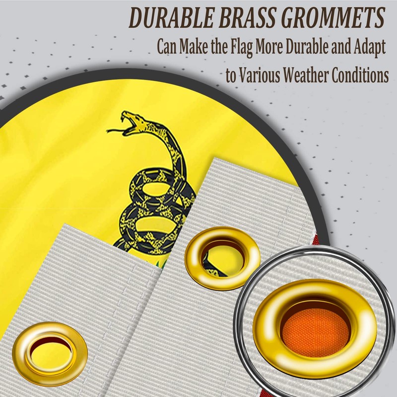 • 2 METAL GROMMETS : Two solid brass grommets of gadsden flags are firmly sewn to the oxford cloth header. Durable and sturdy,it was made to withstand high winds