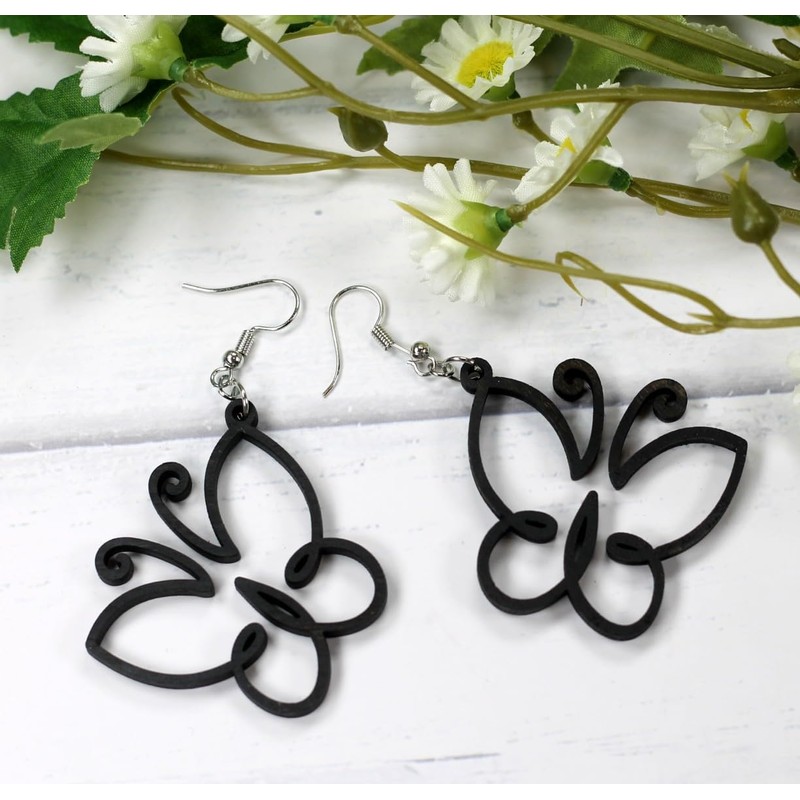 Doodle Line Butterfly Earrings in Black - Rustic Wood Earrings with French Hooks