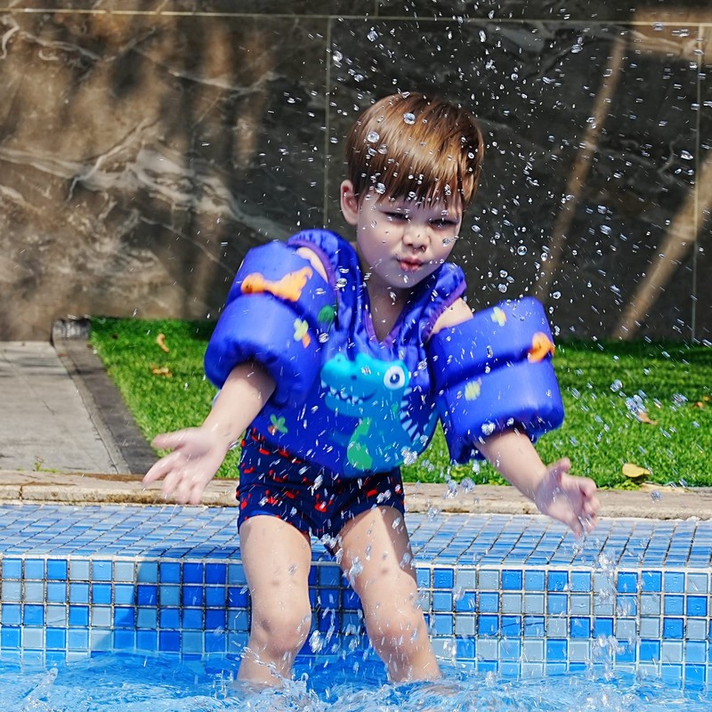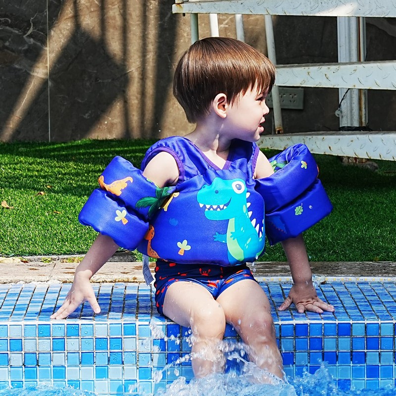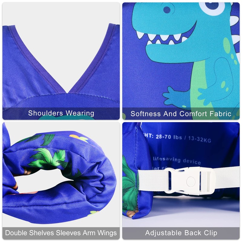 - SAFETY AND DURBALE: The inner surfaces are made of polyester for softness and comfort. The Swim Vest with arm wings is more secured with a safety buckle at the kid’s back, it avoid the kids open it alone.