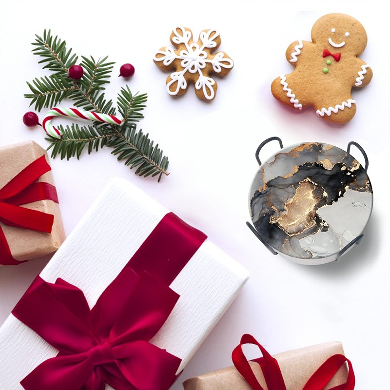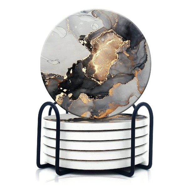 Dooke Coasters for Drinks, Round Absorbent Ceramic Stone Coasters Set of 6 with Cork Base,Drink Coasters with Holder for Cold Drinks Wine Mugs and Cups Tabletop Protection, 4 Inches,Gold Marble