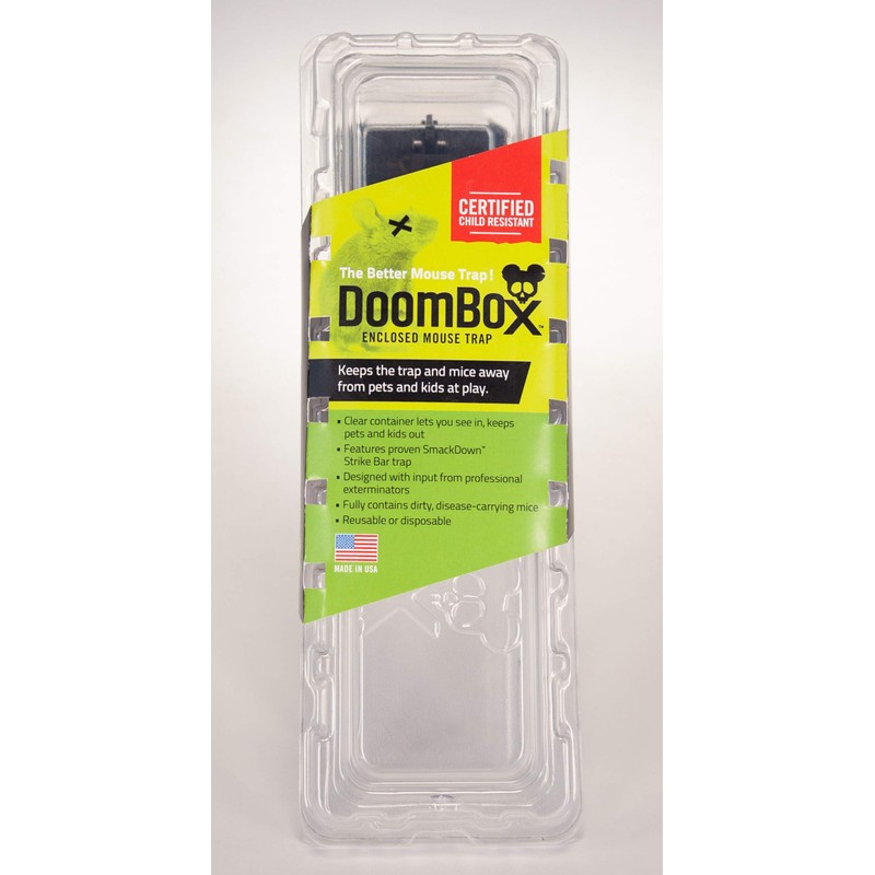 DoomBox is an enclosed mouse trap that features a premium, SmackDown kill-bar style trap, and dual entrances (so mice see a way out). The patented Click-it Closure technology is easy to open, but Certified Child Resistant to keep kids and pets out. Many of the places where people catch mice are the same places that are left unchecked until it is too late. Owners return to an awful smell, an awful mess, and even worse…”liquified mouse.” This is where DoomBox, with its ability to “keep the mess with the mouse,” shines! Designed with input from professional exterminators, the DoomBox is reusable or disposable. Ideal for places where traps are left unattended – boats, cabins, RVs, and campers. Plus, DoomBox is 100% Made in the USA!