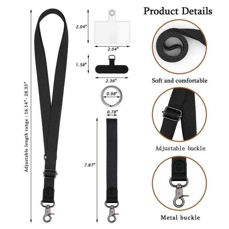 - Fits All Mobile Phones:Universal phone lanyard for all smartphones with a full-coverage phone case.The tether has a width of 0.78 inches (2cm),a wrist strap length of 6.3 inches (16cm),and a neck lanyard length of 19.6-28.3 inches (50-72cm).Note: Not support half coverage phone case.