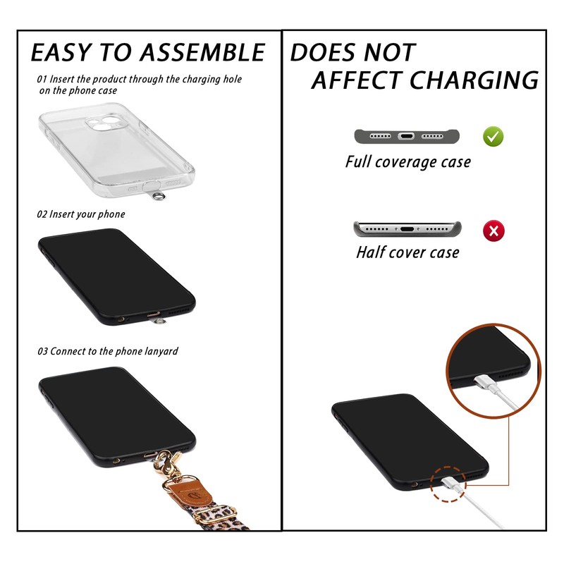 - Easy to install and charge:No tools required,pass the pad through charging hole of fully covered phone case,then insert your phone and connect to the phone lanyard.The tether tab does not block your charging hole,so you can easily charge your phone while using the item.