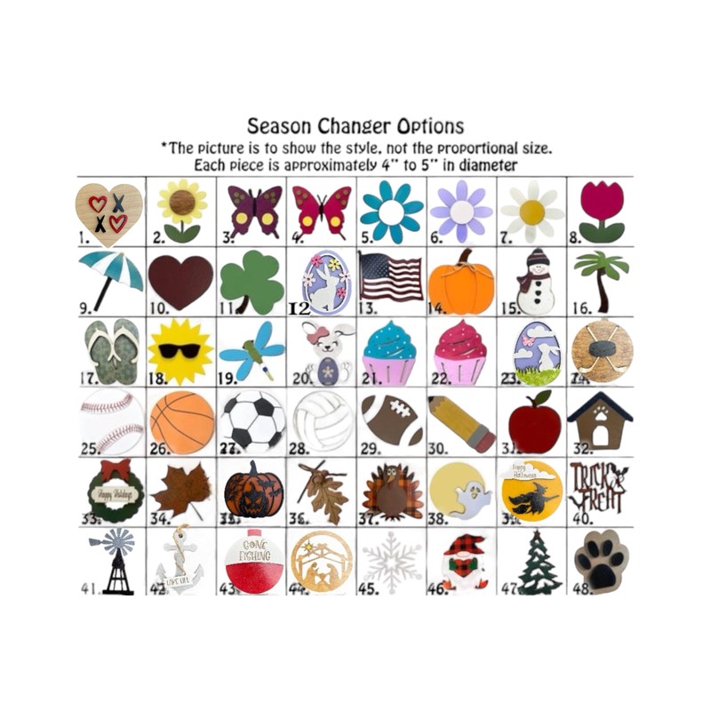 *Industrial strength magnet to securely hold the season changer piece. The pieces have a metal disc on the back to easily magnify to the magnet.