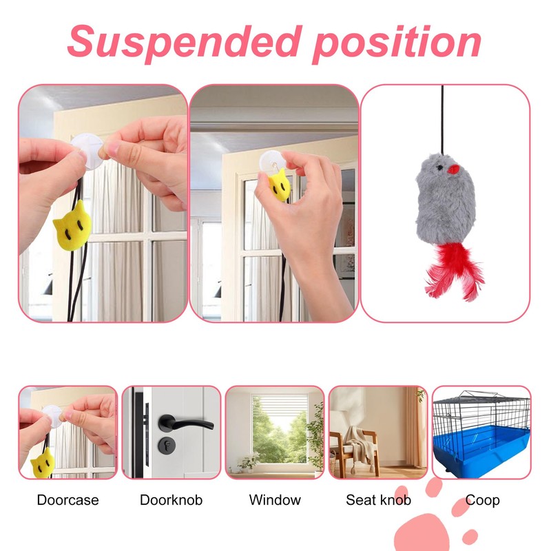 - 【Easy Installation】The hanging cat toys includes adhesive hooks for quick setup on door frames, walls, or ceilings. The residue-free adhesive ensures damage-free removal, while the adjustable cord lets you customize the height for different cat sizes. Perfect for small spaces, it encourages vertical play without floor clutter.