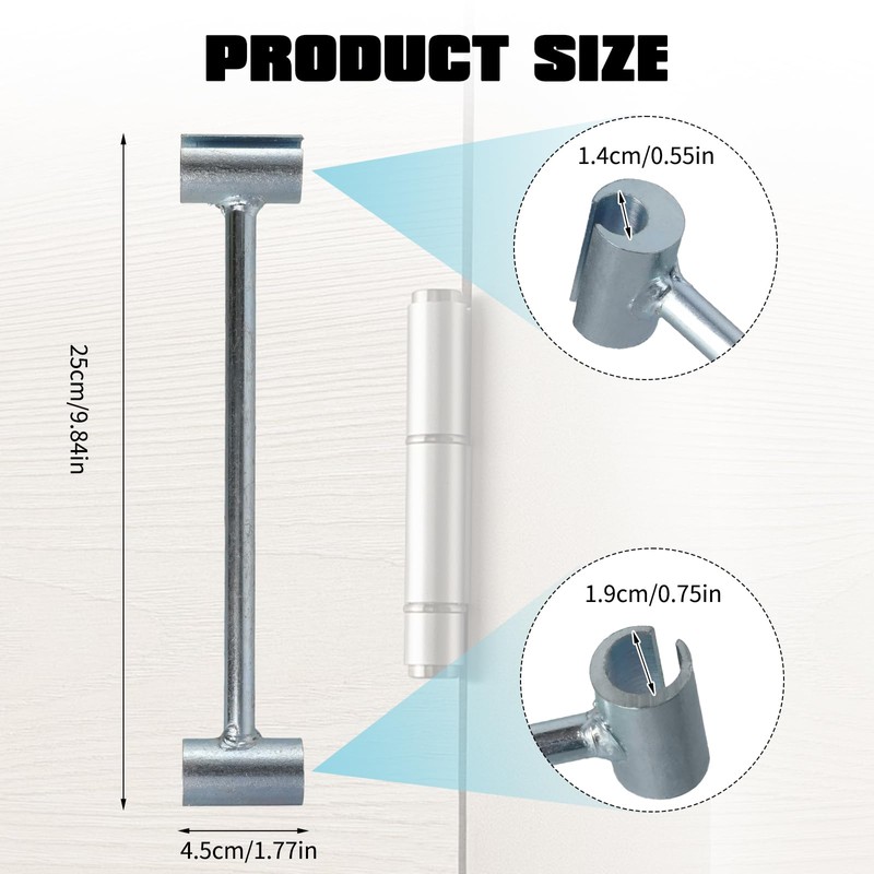 - Ergonomic Design: This door hinge tool makes hinge adjustment easy, with a small inner hole of 0.55 inches, a large inner hole of 0.74 inches, a total length of 9.84 inches, and a thickness of 1.77 inches, even in tight spaces. Whether you are performing a complex installation or a standard repair, this hinges gap adjusting wrench allows you to easily adjust hinges without any effort.