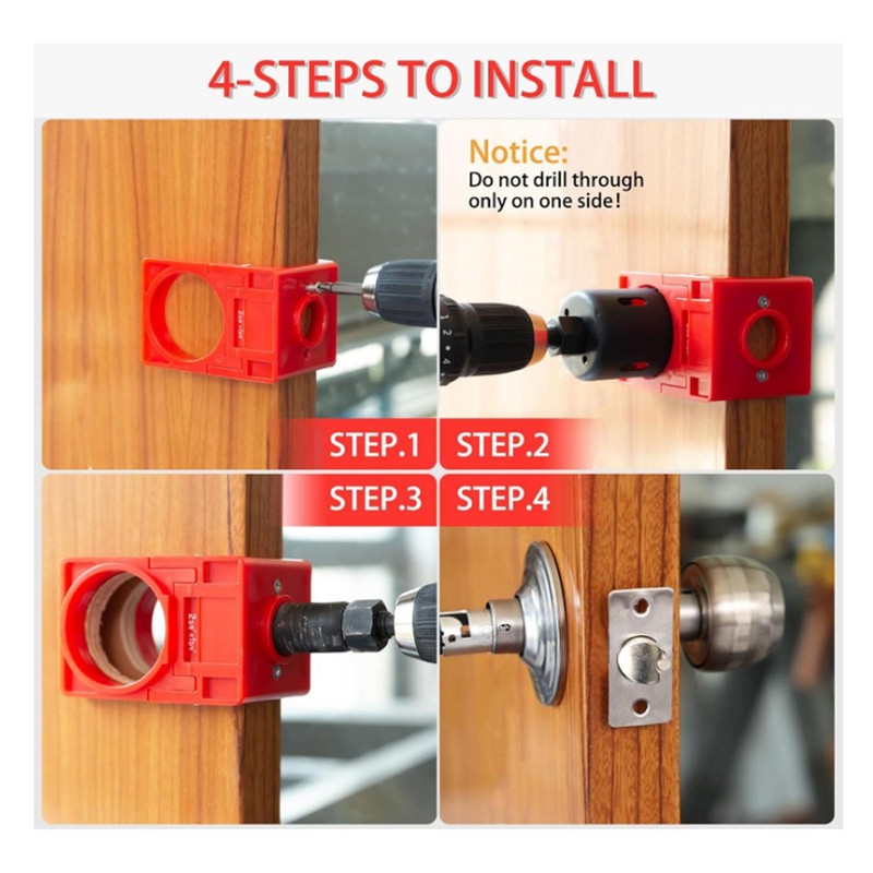 3. Convenient Design: Suitable for common lock sizes and ideal for wooden doors. The adjustable plastic guide template fits 1‑3/8 inch and 1‑3/4 inch thick doors, suitable for 2‑3/8 inch and 2‑3/4 inch backsets.