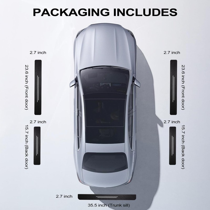 - specifications/Packaging: includes 5PCS car door threshold stickers (2 front doors, 2 rear doors 1 one tailgate). front doors is 23.6×2.7 inches in size, and the rear doors 15.7×2.7 inches, one tailgate is 35.43×2.7 inches, can be universally applied to most vehicles.