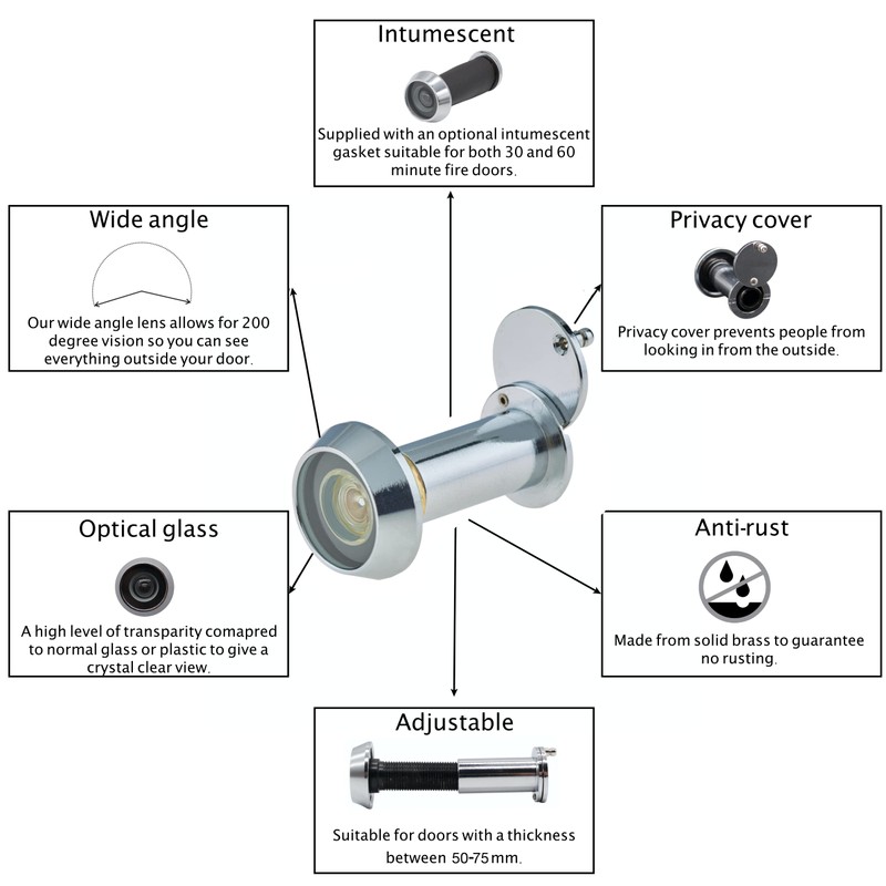 Door Viewer Polished Chrome Peephole Wide Angle 50-75mm Thick Doors