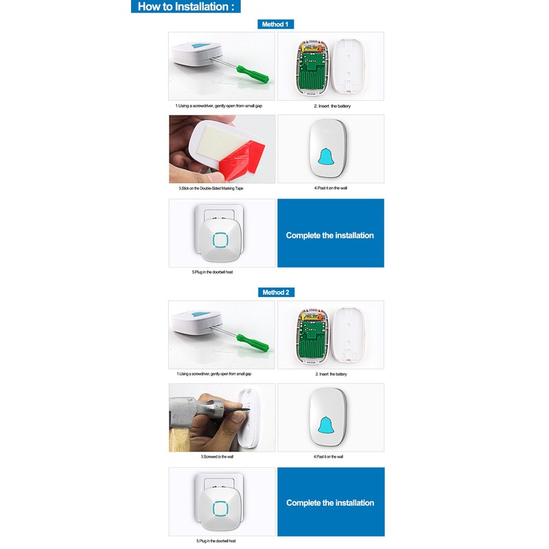 - Easy to Install & Use - Easily plug receiver into an electrical outlet (no batteries required for main receiver). The push button can be fixed to the doorframe with the attached adhesive tapes. Simply mount the doorbell where needed and you are ready to go.