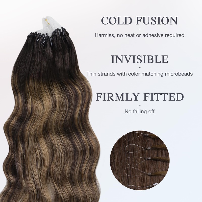 - [Invisible Cold Fusion Installation] Micro link hair extensions are cold fusion extensions, which requires no heat or glue for the installation, minimizing damage and protect your own hair. Hair extensions are easily put on and taken off by using microbeads. Each strand of extension is 1g and is weightless to wear. The beads also match the hair color to provide invisible wearing effect.