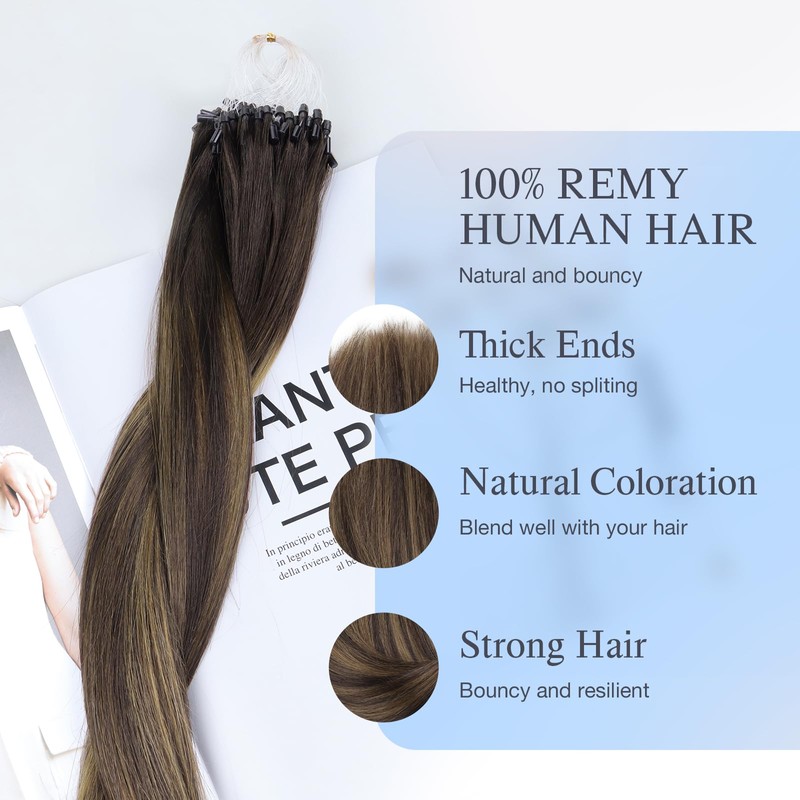 DOORES Micro Human Hair Extensions Loops Real, Balayage Dark Brown to Chestnut Brown 14 Inch 50g/50s, Shorts with Bead