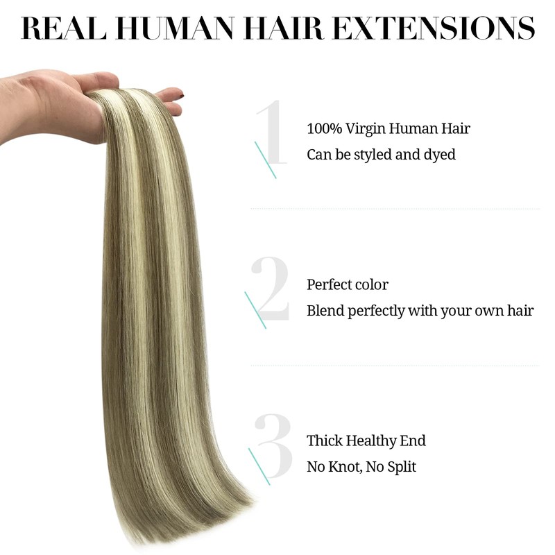 - Remy human high quality hair, long-lasting and reusable, 100% Remy human hair extensions. Thick & full ends, natural silky appearance and soft touch, shiny, shiny, no tangle, no tearing. The hair can be washed, straightened, curled, etc. The hair extension is like our own hair, it needs careful care to last 4 months or more.