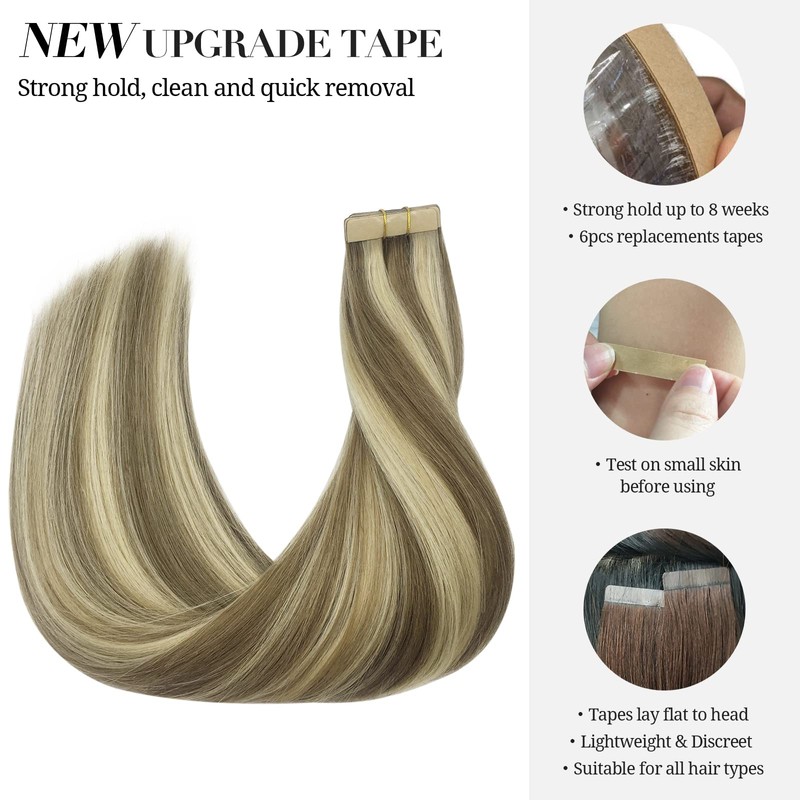 DOORES Tape-In Real Hair Extensions, Light Run, Highlighted Medium Lon, 45 cm (18 Inches), 50 g, 20 Pieces, Remy Real Hair Tape Extensions, Remy Hair Extensions, Invisible Real Hair