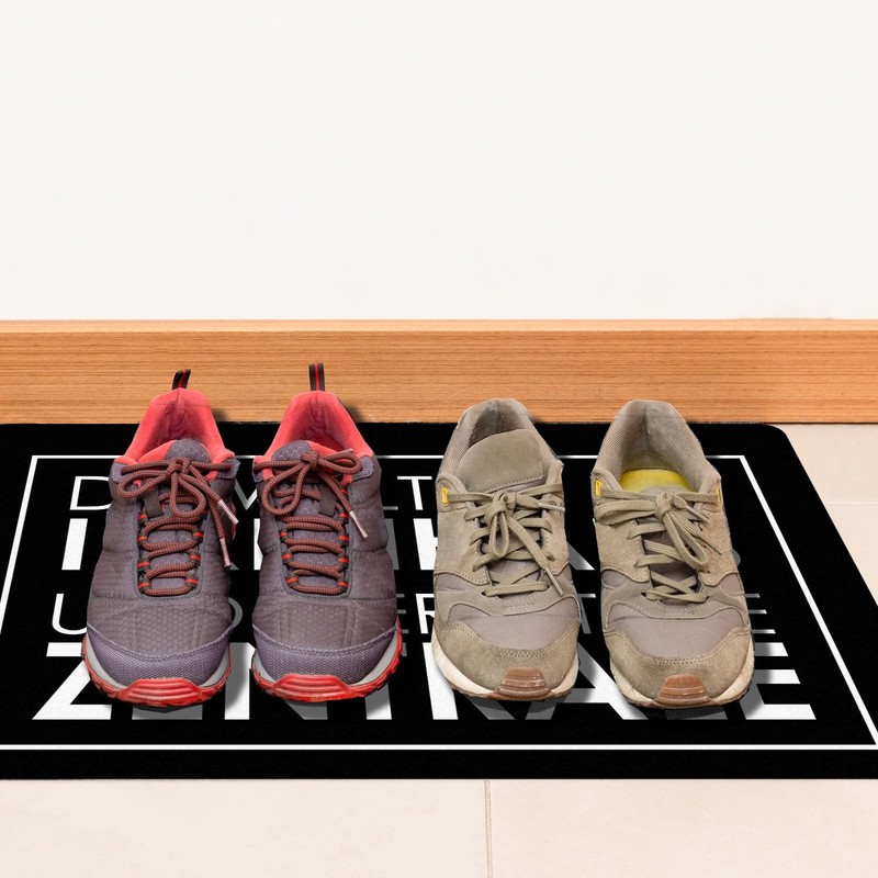 - The doormat with the funny saying has a simple design on a black background. The inscription is printed in clear, thick letters and is easy to read.
