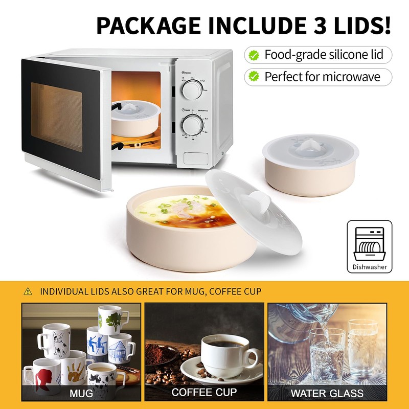- REUSABLE AND UNBREAKABLE MICROWAVE EGG MAKER - Package include 3 small bowls with 3 lids, each bowl measures 4 inches in diameter and 1.3 inches in depth, volume is 6 fl.oz per bowl. Reusable and unbreakable, great size for egg bites, breakfast sandwiches, eggwich or baked egg! Individual silicone cover is almost suitable for cups, mugs, water glass, to prevent food from splashing and boiling in microwave or keep fresh.