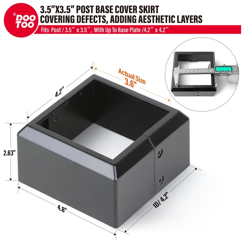 - SIZE SPECIFICATIONS: Suitable for installations with standard 4"x4" (Actual: 3.5"x3.5") Post, Base size 4.4"x4.4". Before purchasing, please measure your railing post dimensions to ensure proper fit and avoid incorrect orders