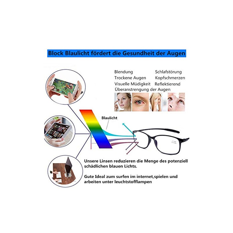 - [Anti-Blaulicht und UV-Schutz] -- Blau Licht blockieren Brille Schützen Sie Ihre Augen vor schädlichen UV-Strahlen und Blaulicht ab. Blaufilter im Brillenglas verhindern, Blenden, Ermüden, Kopfschmerzen und trockene Augen aufgrund von kurzwelligem blauen Licht, da sie dieses nicht zur Netzhaut durchlassen
