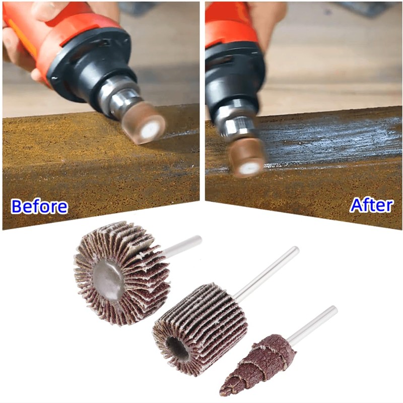 - [MATERIALS]: The die grinder flap wheel is made of 80 grit high-performance alumina particles & emery cloth substrate, with strong grinding force and uniform surface treatment effect