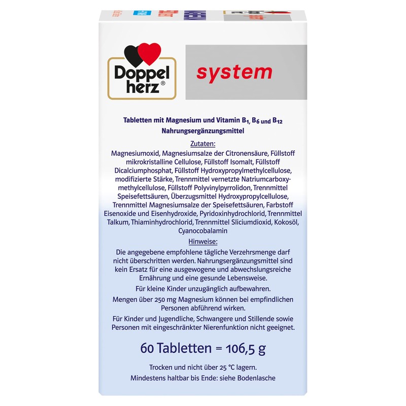 - Box contents: 60 tablets – dietary supplement with magnesium, vitamin B1, B6 and B12 – net capacity: 106.5 g