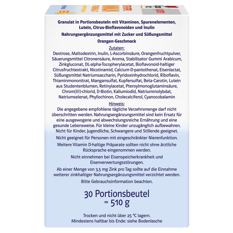 - Box contents: 30 granulate portion bags – dietary supplement with vitamins, trace elements, lutein, citrus bioflavonoids and inulin – with orange flavour – net capacity: 510 g