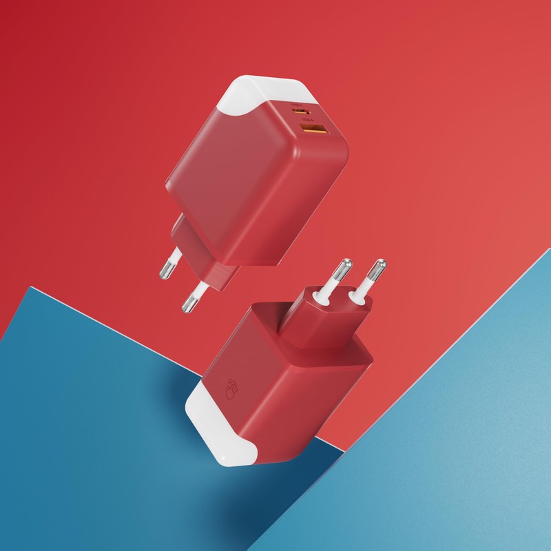 Doppelte Schnelllade-Netzadapter mit 65 W - USB- und USB-C-Anschluss - Ideal zum Laden von Telefonen, Tablets und Laptops - Mit Touch-Licht Ein/Aus - Xoopar ICE-G Rot.