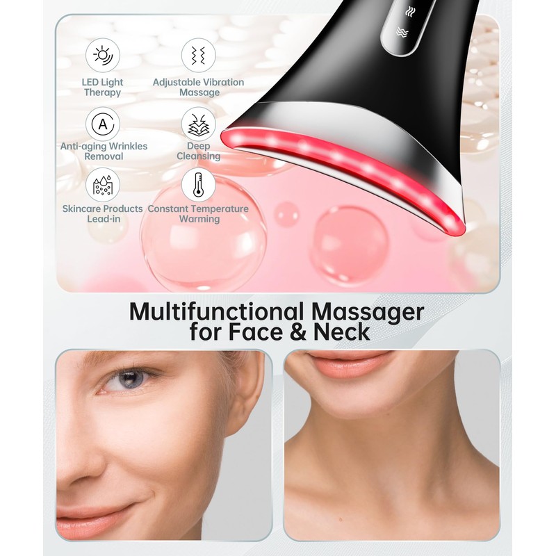• Multifunctional Face Light Therapy: This facial massager is based on 7 color light, heating and adjustable vibration, with various skincare functions and suitable for all ages and skin types. Targeting your face, neck, or body, it delivers comprehensive skincare solutions to address various skin concerns, promoting elasticity and a firmness