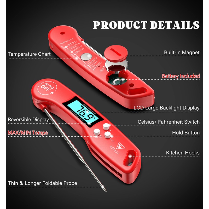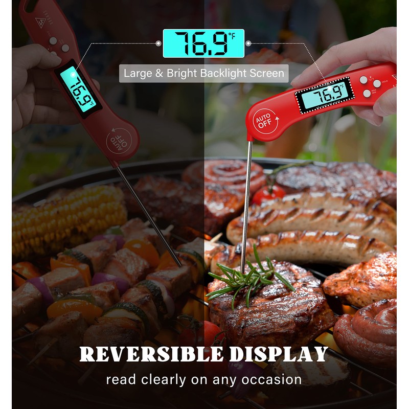 • CLEAR AND REVERSIBLE DISPLAY: You will get the clarity temperature with the bright and large LCD screen, also you can read the meat temperature in the dark while grilling with backlit button! And the Exclusive auto-rotating display rotates automatically depending on how the instant read thermometer is held. (Note: Kitchen thermometer is not waterproof except for the stainless steel meat probe.)