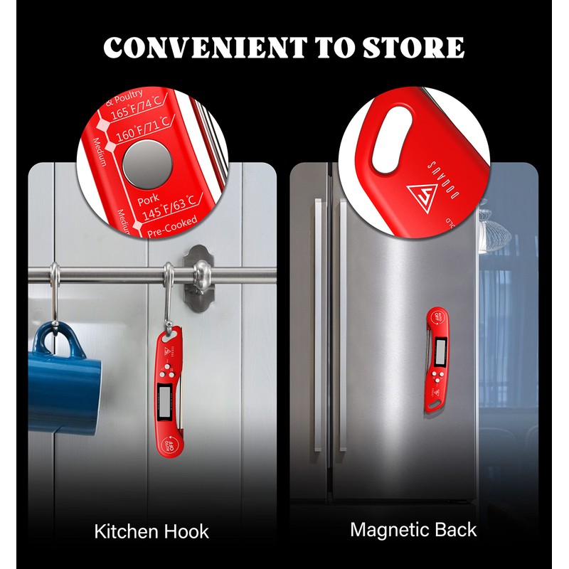 • MORE FUNCTIONS: ①You can read the Internal temperature after removing the kitchen temperature probe from the food by the Hold button! ②MAX/MIN: Short press to show the MAX or MIN temperature value for the tested food. ③Turkey Thermometer will Auto-shutoff if readout stays on for 10 minutes! The cooking thermometer probe turns on or off when you unfold or fold the probe. ④Magnetic back and hook allow for convenient storage. No more digging through the drawer to find the food temperature probe.