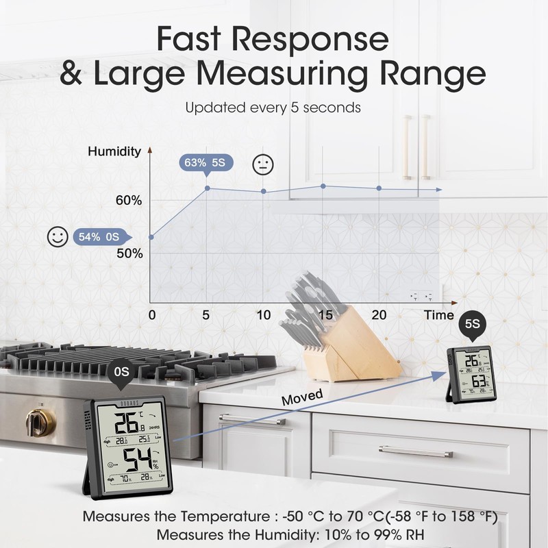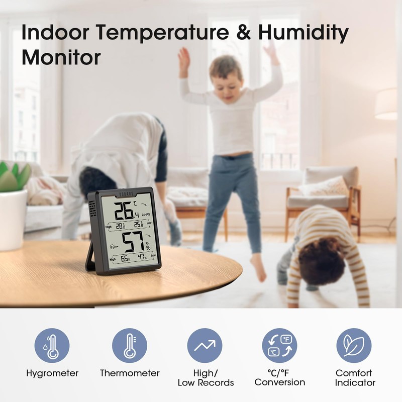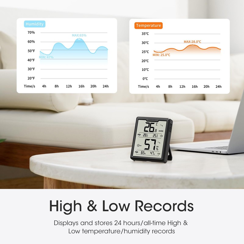 - POWERFUL & COMPACT & PORTABLE - Small but powerful thermo-hygrometer. The hygrometer humidity meter updates the trend of temperature and humidity every 5 seconds, allowing you to prepare in advance and adjust the thermostat or humidifier; In addition, the baby room thermometer also has the highest and lowest humidity and temperature records, one button to switch the record within 24 hours or the historical highest and lowest records, which makes it convenient for you to observe and record the climate.