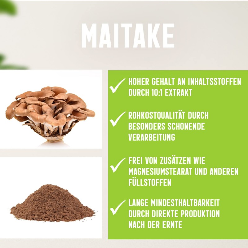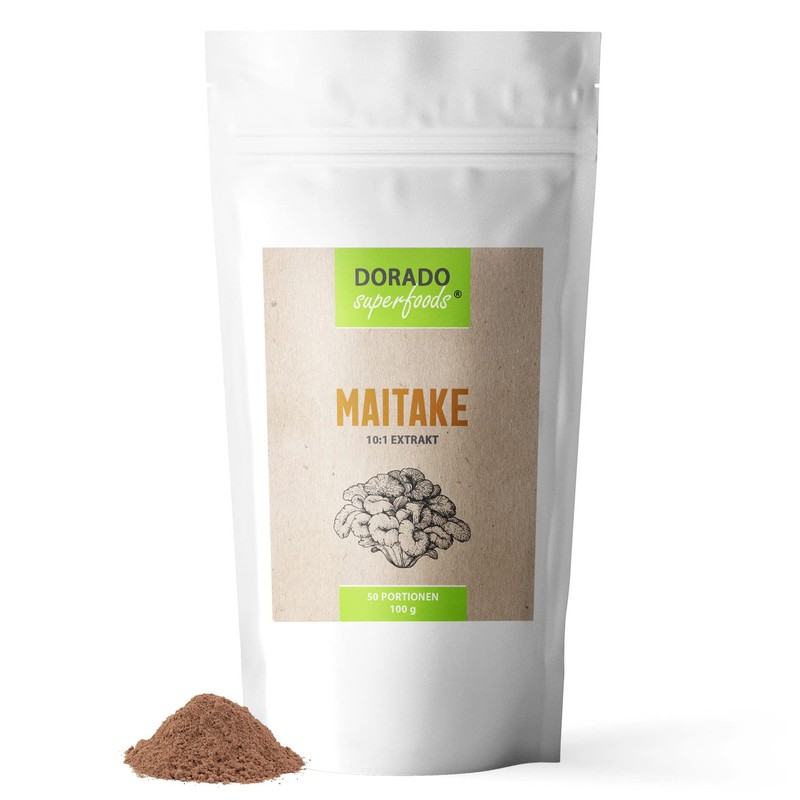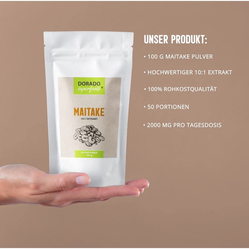 • High dose and free of additives – our Maitake powder consists of pure 10:1 extract – 10:1 means that 1 kg of concentrated extract is obtained from 10 kg of Maitake fruit bodies. Only water is used as a solvent. It is therefore a particularly highly concentrated powder - free from unwanted additives.