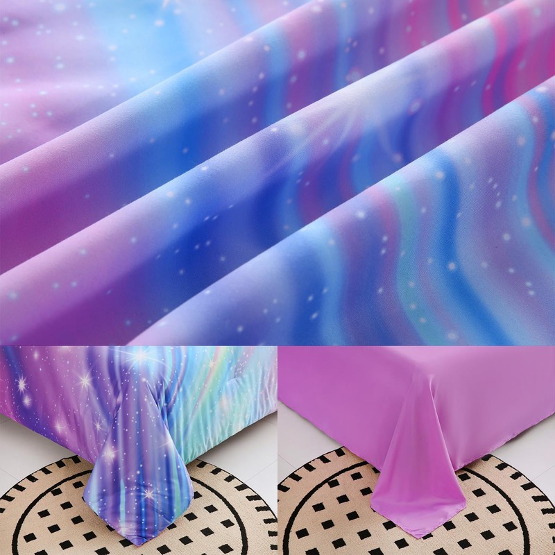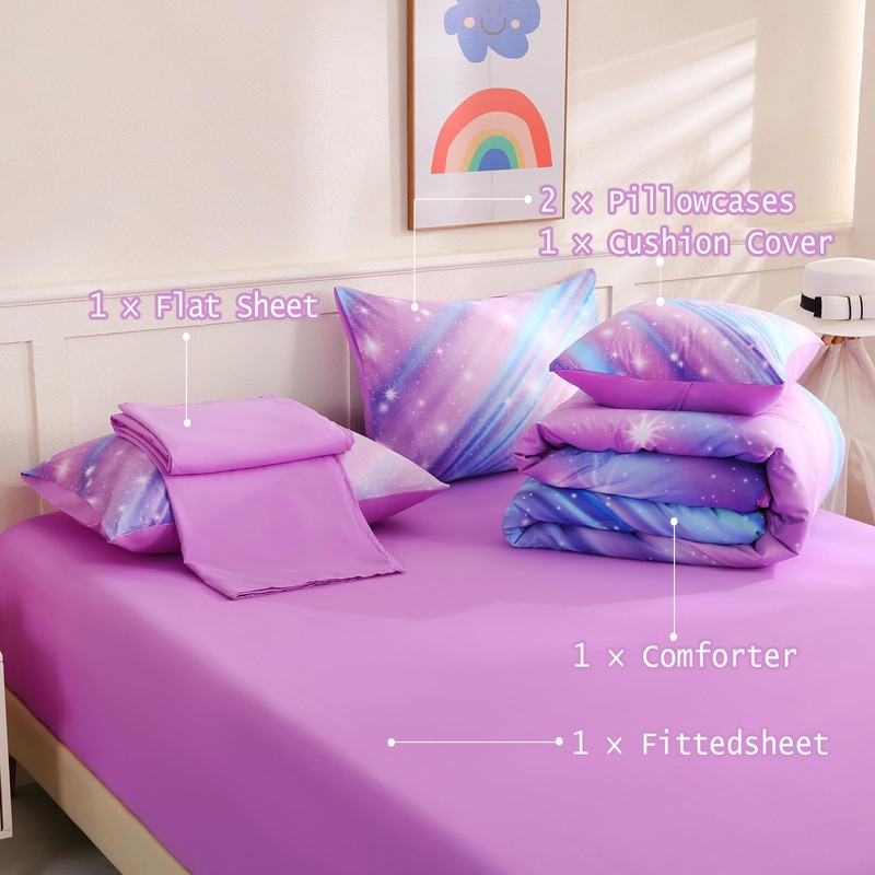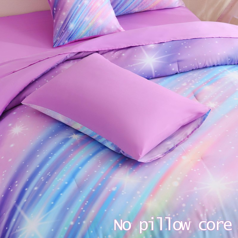 DORCAS 6 Pcs Rainbow Twin Bedding Sets Purple Glitter Galaxy Twin Size Comforter Set with Sheets for Girls Kids Teens