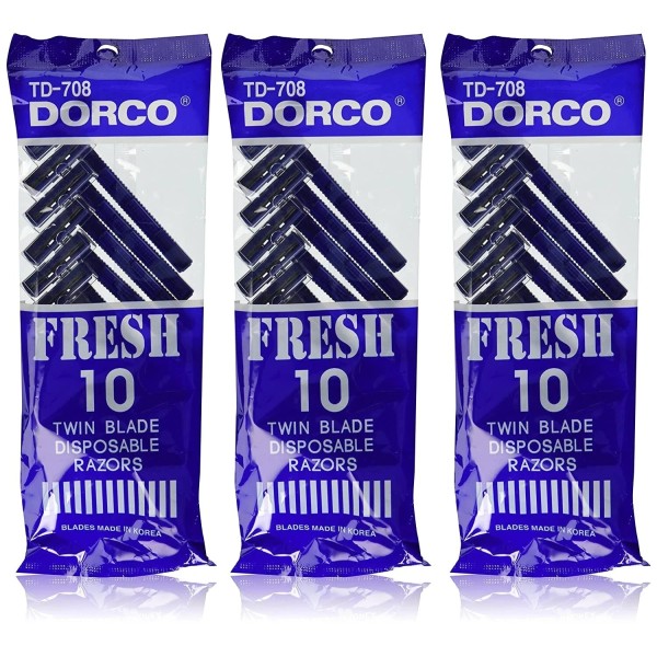 Dorco 3 PACK -30 count Dorco Blue Twin Blade Disposable Razors For Men TD-708