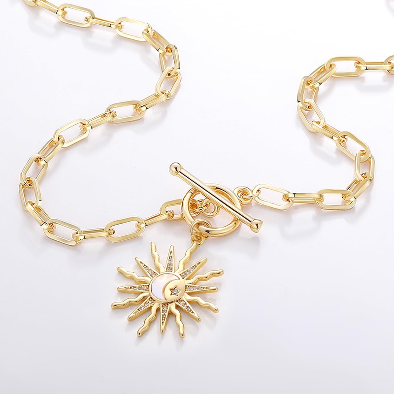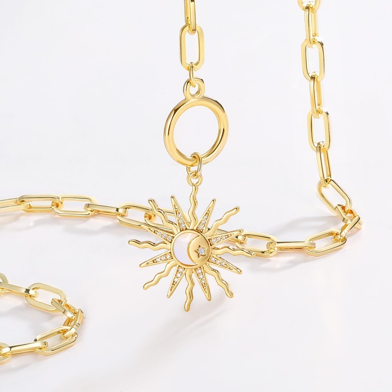 - Chic Sun Necklace –Our sun necklace features a radiant sun pendant with sparkly pave-set rhinestones on sunbeams centered by a crescent moon made of abalone shell that resembles the luster of mother-of-pearl and a twinkling star. The pendant is a trifecta of celestial glory-sun, moon and star, symbols of everlasting luminance, and enduring serenity that so pervades our galaxy beyond the vicissitudes of life's ebb and flow, born with the explicit intention of adorning its beholder with a radiance that transcends every facet of life
