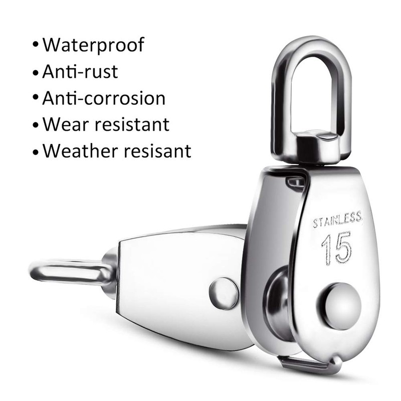 Features \- Material: 304 Stainless steel. \- Size: 2.36 * 0.59 * 0.23 inch \- High Quality: Anti-rust and wear-resistance with highly strong structure. \- Ergonomic Design: 360 degrees rotation to prevent rope from knotting for convenient use. \- Delicate Appearance: Wear and scratch resistance with gorgeous gloss. \- Convenient to Use: Flexible sliding pulley with heavy load capacity for numerous application.