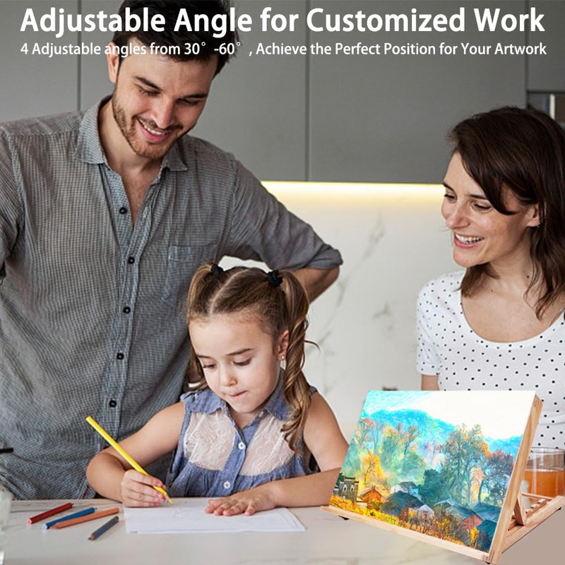 - 👌【Ángulo Ajustable】Hay 4 posiciones de ángulo diferentes para diferentes estilos de pintura. La base de caballete grande y fuerte con 4 pies de goma duraderos funciona súper bien, el tablero de dibujo nunca molestará temblando mientras presiona sobre él.