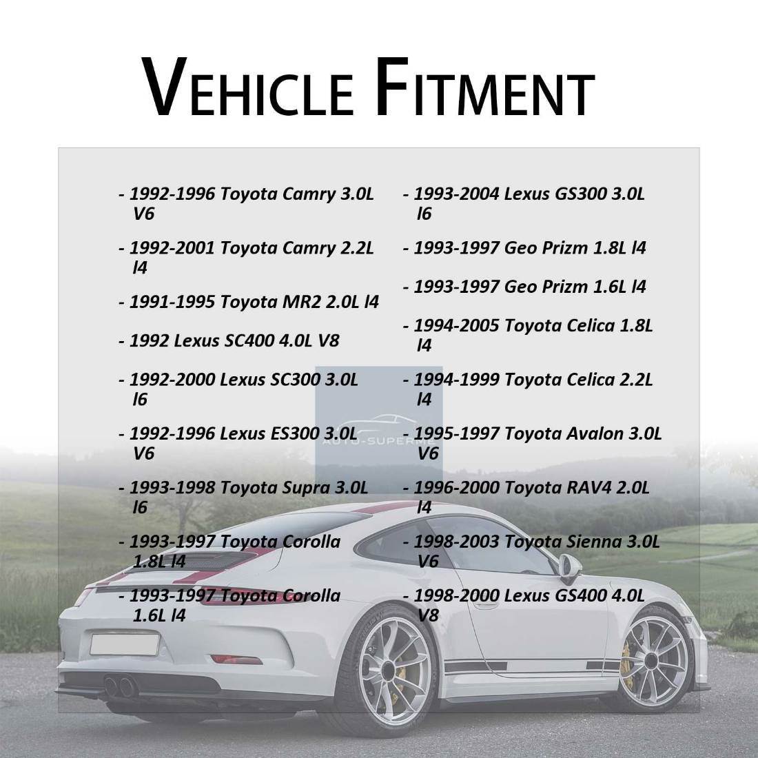 OE/OEM Part Number: 1993 1994 1995 1996 1997 Geo Prizm 1.6L 1.8L l4,1993 1994 1995 1996 1997 Toyota Corolla 1.6L 1.8L l4,2005 2006 2007 2008 2009 2010 Scion tC 2.4L l4,1995 1996 1997 Toyota Avalon 3.0L V6,1998 1999 2000 2001 2002 2003 Toyota Sienna 3.0L V6,2001 2002 2003 2004 2005 2006 Lexus GS430 4.3L V8,2001 2002 2003 2004 2005 Lexus IS300 3.0L l6,2002 2003 2004 2005 2006 2007 2008 2009 2010 Lexus SC430 4.3L V8,1992 1993 1994 1995 1996 Lexus ES300 3.0L V6,1998 1999 2000 Lexus GS400 4.0L V8,2001 2002 2003 Lexus LS430 4.3L V8,1991 1992 1993 1994 1995 Toyota MR2 2.0L l4,1992 1993 1994 1995 1996 1997 1998 1999 2000 Lexus SC300 3.0L l6,1992 Lexus SC400 4.0L V8,1993 1994 1995 1996 1997 1998 Toyota Supra 3.0L l6,1996 1997 1998 1999 2000 Toyota RAV4 2.0L l4,CE, XLS, LSi, Base, XL, Spec, GTS, DX, Turbo, All, LE, DLX